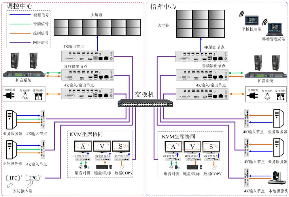 5.分布式KVM坐席管理系统:采用67个视频输入输出分布式节点,通过分布式系统实现两中心设备控制、IPC直接接入、远程电话接入及语音对讲