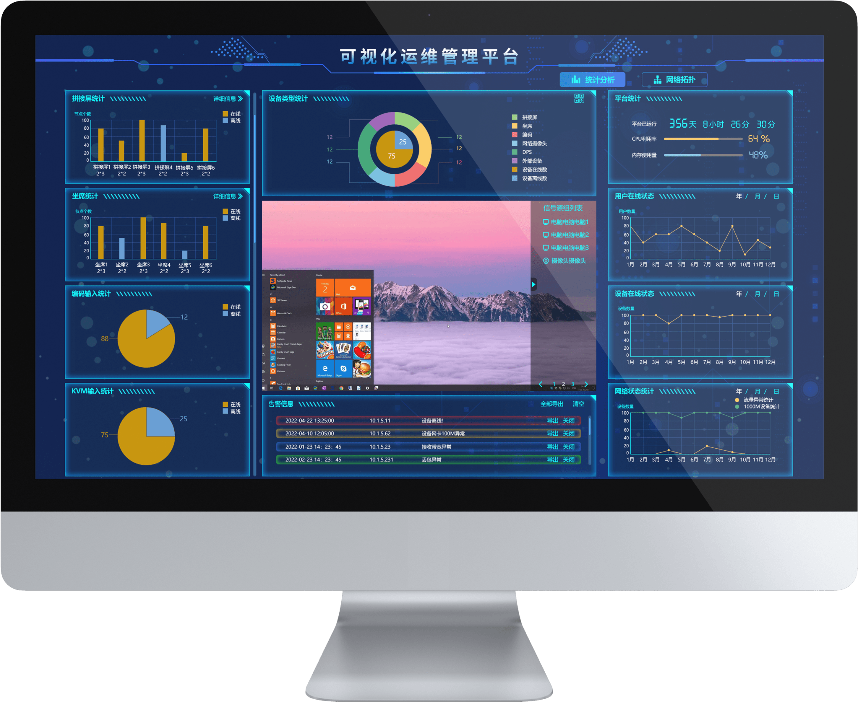 为了解决上述问题,BBIN·宝盈集团科技推出了AS-VMP可视化运维管理平台,该平台主要用于分布式KVM坐席拼控系统在日常运行过程中的状态监控,可以直观的展现系统中对应设备的相关信息,包括设备数量,设备种类以及设备的在线/离线状态。同时能够显示系统的总体运行时间,可以根据时间轴查询过往的用户,设备的在线数量。另外平台还支持信号源预览功能以及告警信息发布功能,可以让现场运维人员直观的了解到信号源是否正常以及快速定位系统中出现的问题。